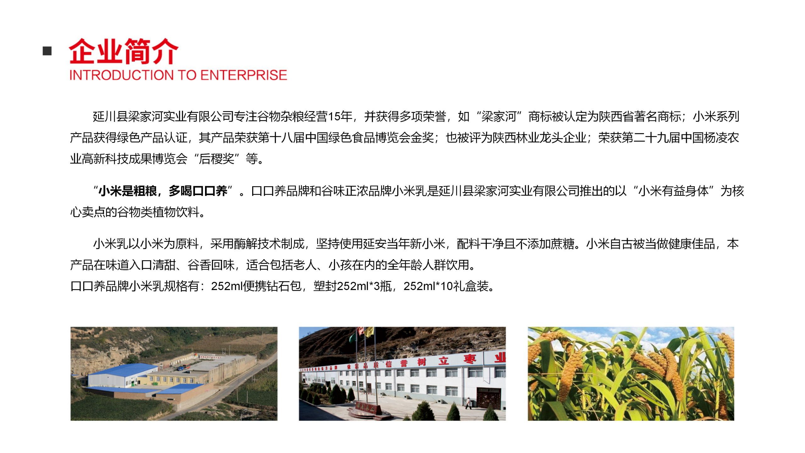 “小米是粗粮,多喝口口养”。口口养品牌小米乳是延川县梁家河实业有限公司推出的以“小米有益身体”为核心卖点的谷物类植物饮料。