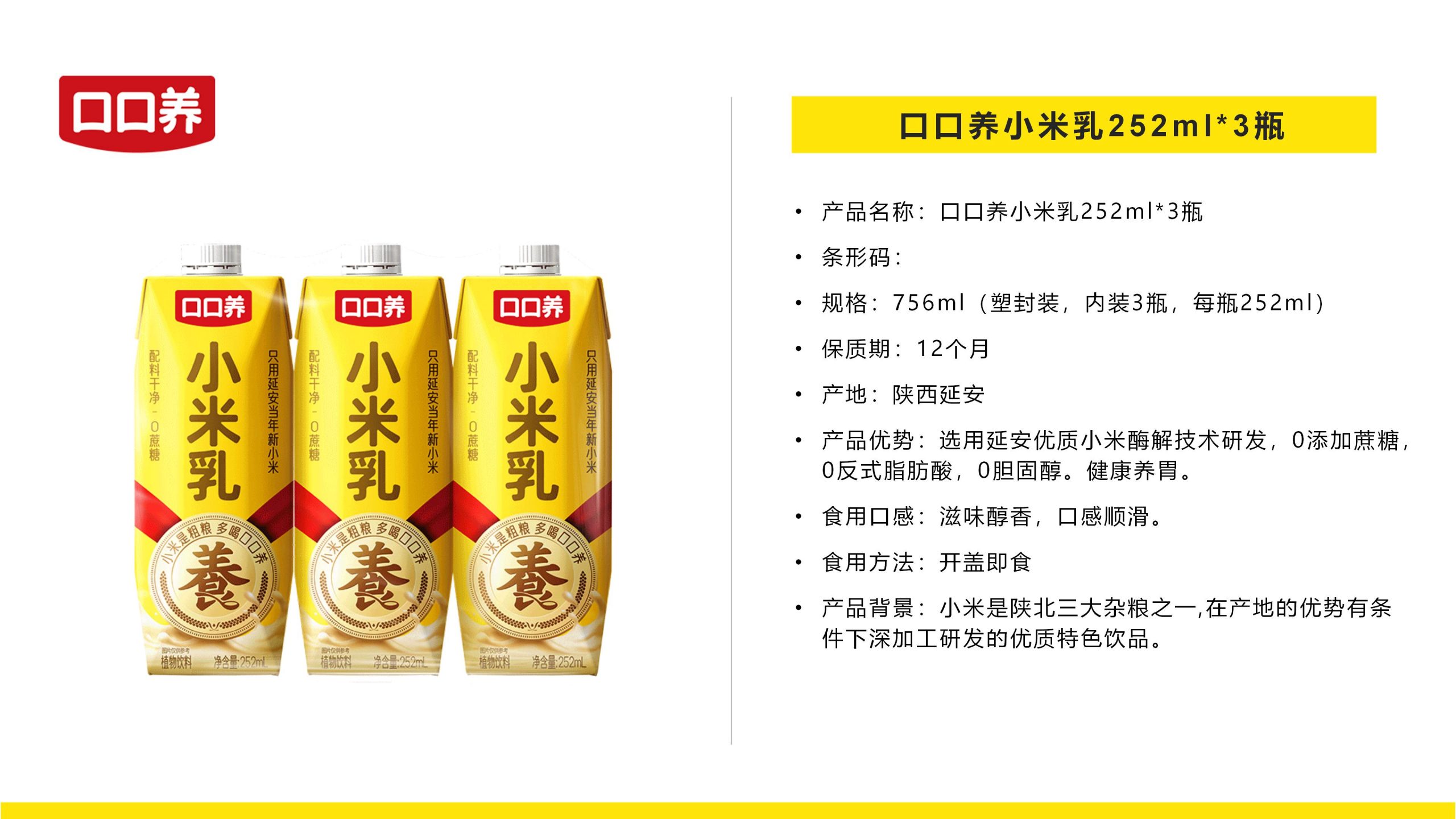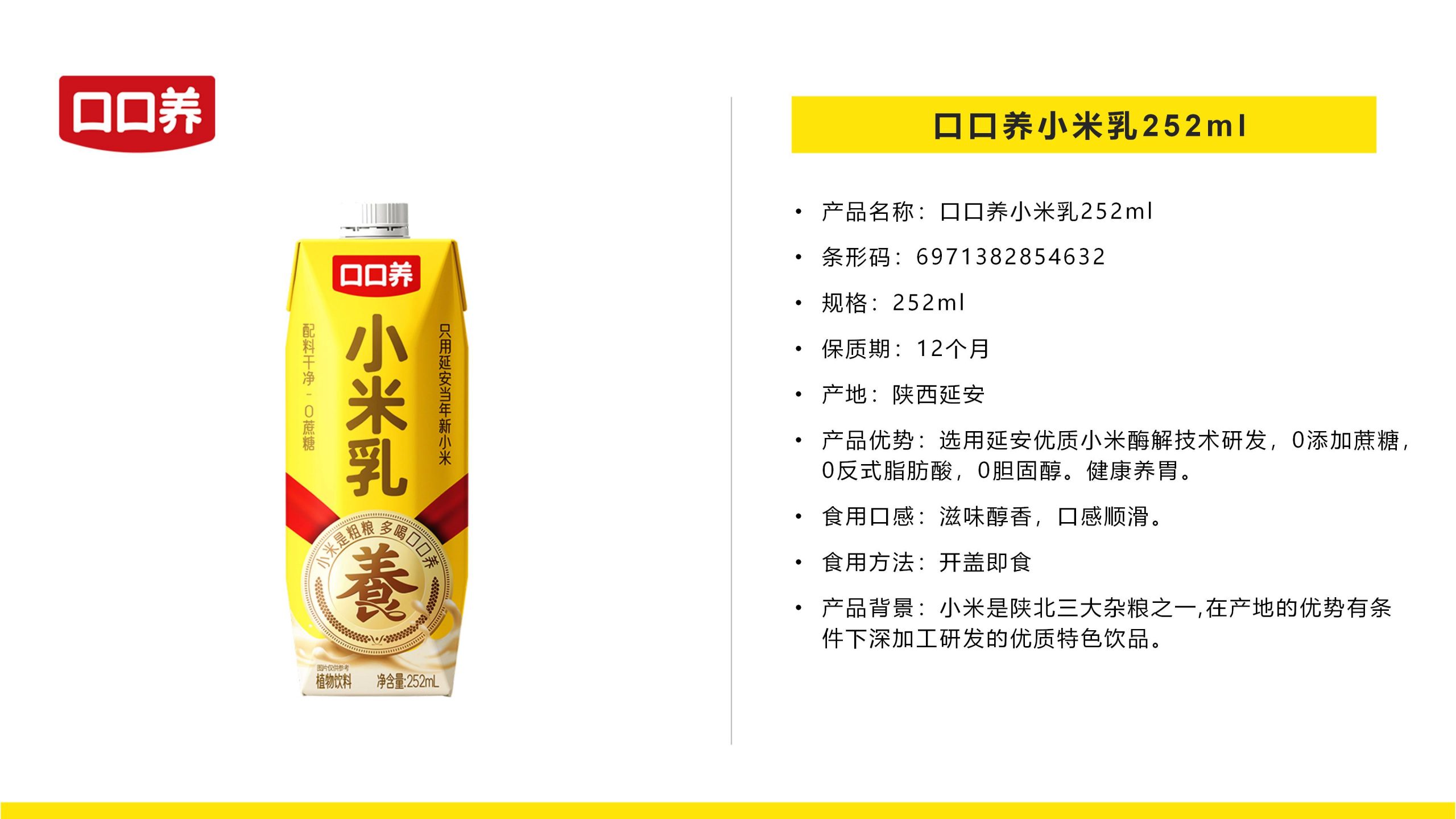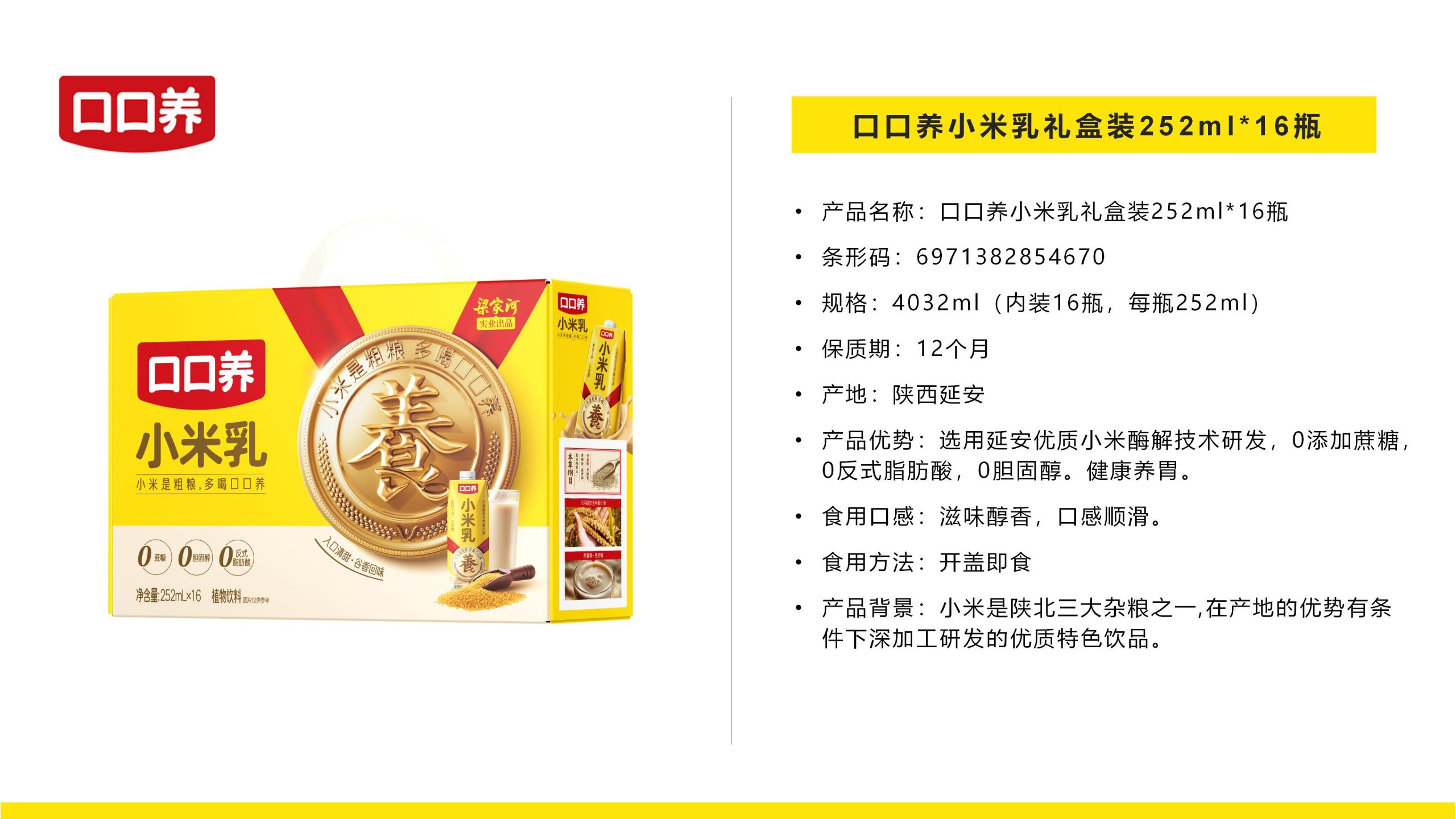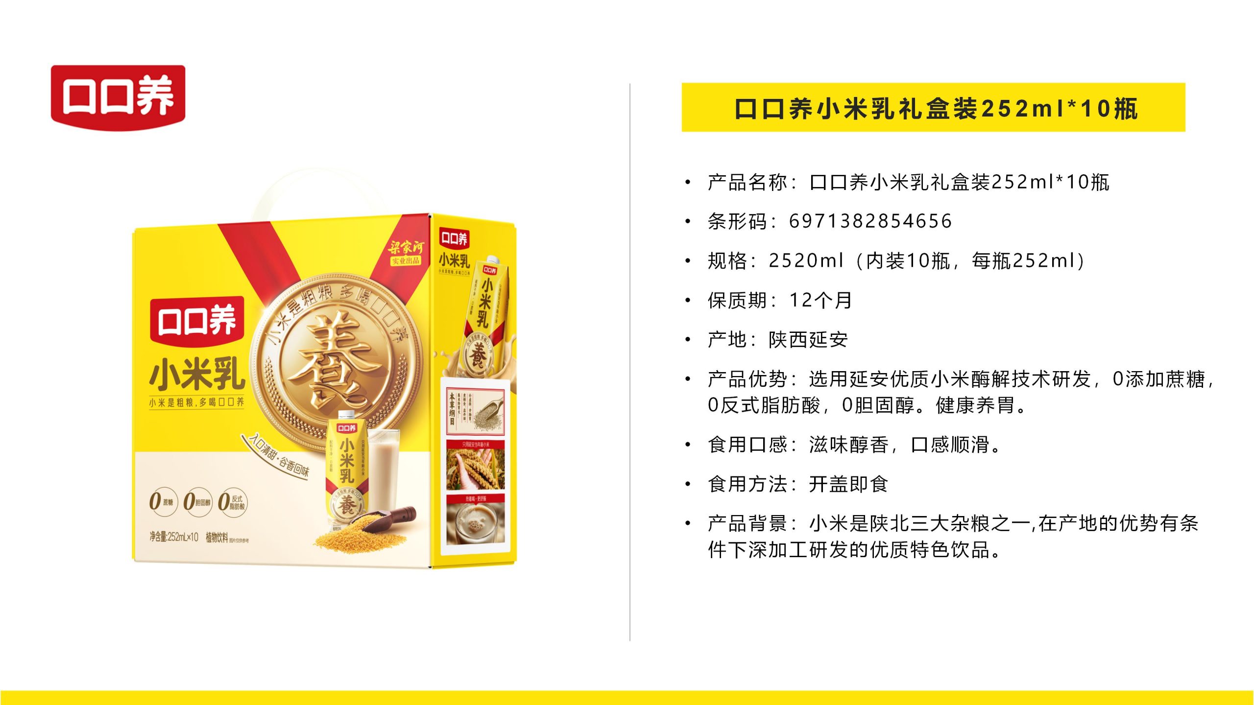 小米乳以小米为原料,采用酶解技术制成,坚持使用延安小米,配料干净且不添加蔗糖。小米自古被当做健康佳品,本产品在味道入口清甜、谷香回味,适合包括老人、小孩在内的全年龄人群饮用。口口养品牌小米乳规格有:252ml便携钻石包,塑封252ml*3瓶,252ml*10礼盒装,252ml*16礼盒装。